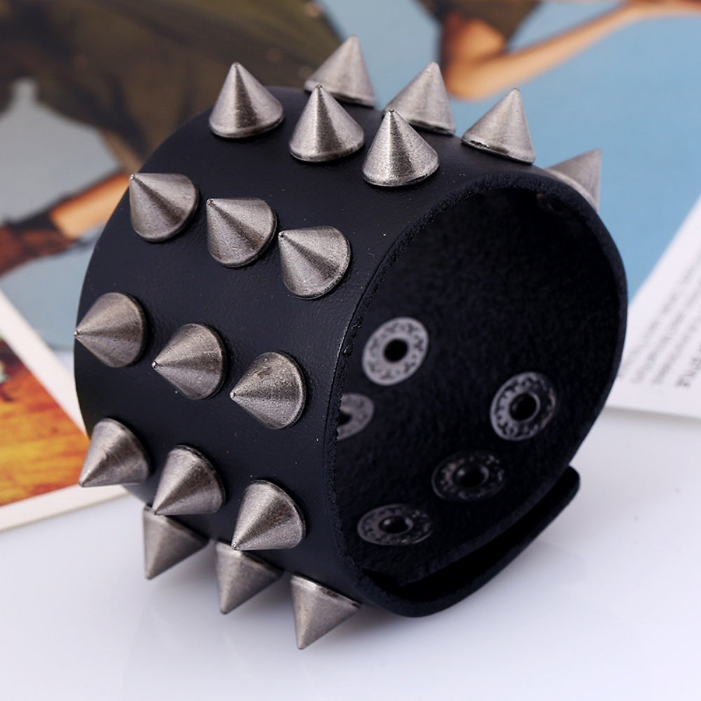 Nous vous proposons ce bracelet avec 3 rangées de clous argentés fermeture avec 2 boucles.